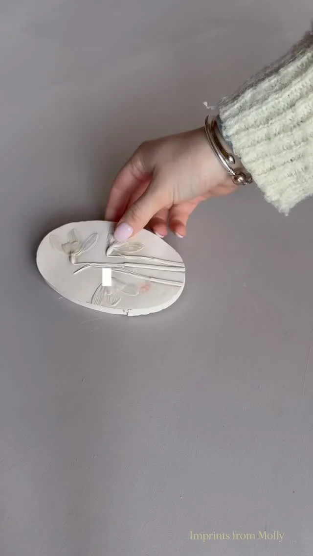 Hand poured and cast from Plaster of Paris. Because of the nature of this casting technique, the Imprints may vary slightly in thickness and sizing. Wall hanging bracket attached on the back of the imprint.