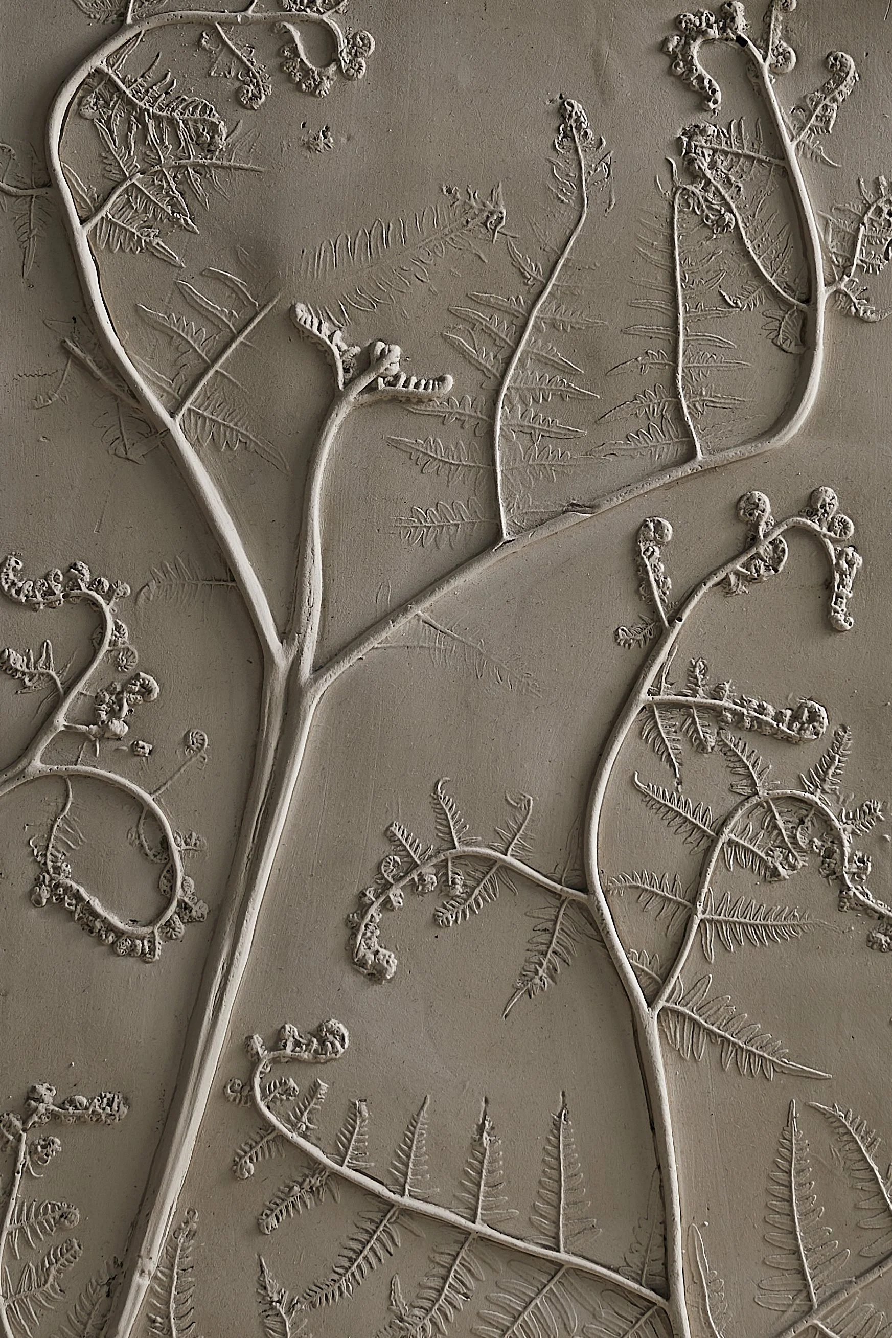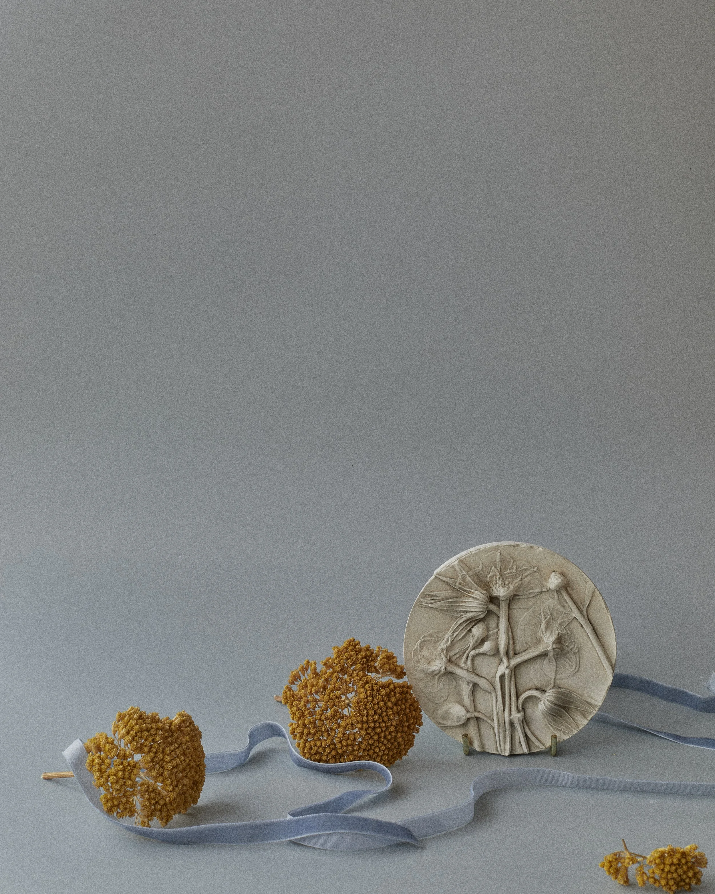 First, we carefully compose the flowers onto clay, taking time to ensure the composition of the flowers works and showcases them perfectly. Once we are happy with the composition, we roll the flowers into the clay to create the initial imprint, then gently remove all traces of the flowers.